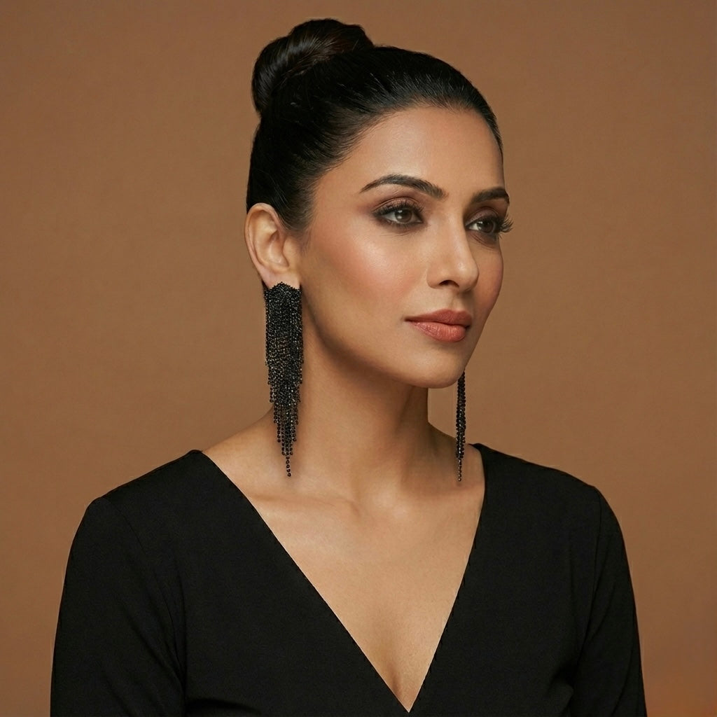 Capture the spotlight with Black Rhinestone Shoulder Dusters, offering a cascade of glittering black stones for a show-stopping effect.