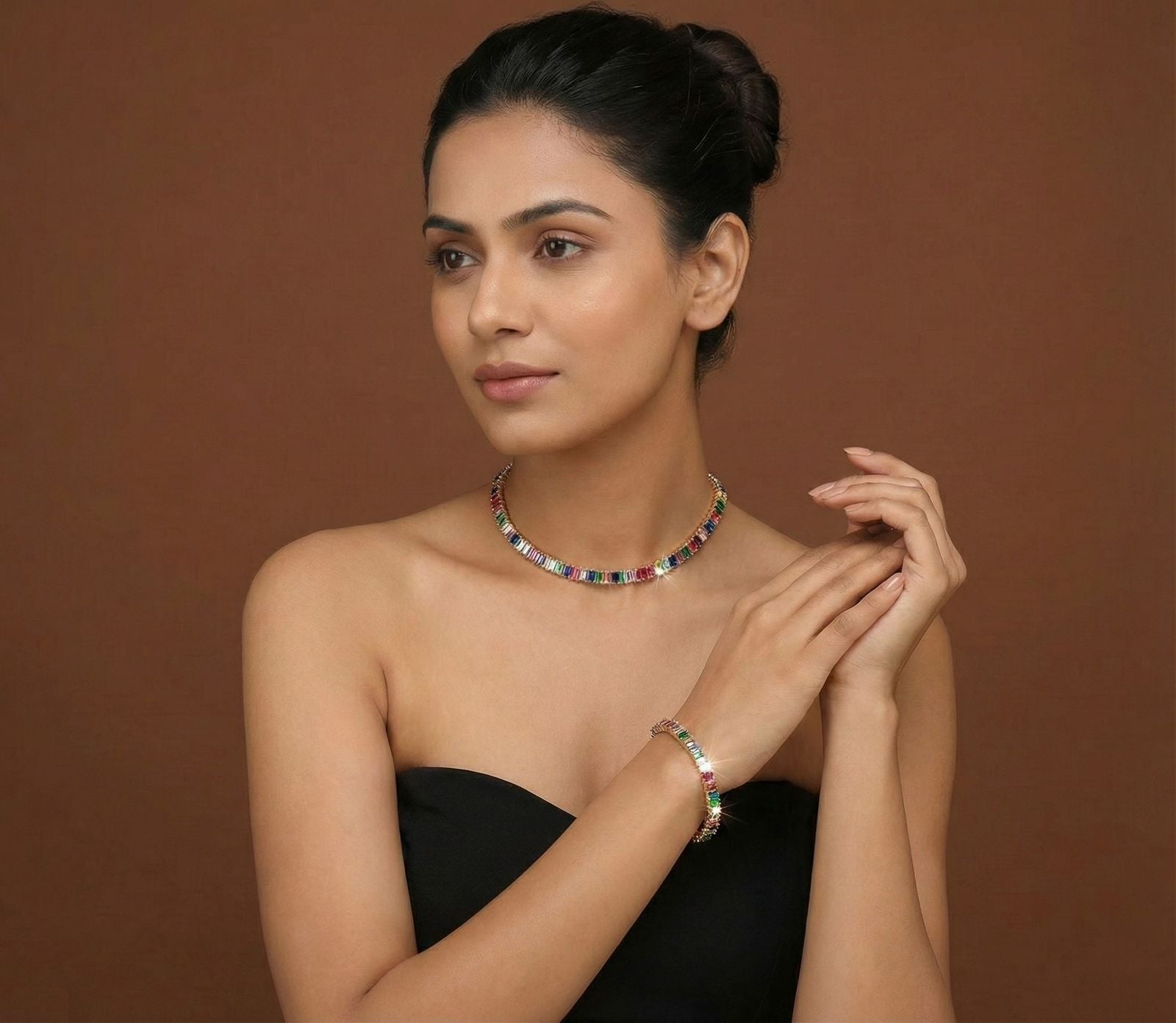 A striking composition of precision-cut multicolour stones, the Chromara Royale Set is designed to sit like armour — confident, composed, unmistakably luxe. Each hue is perfectly aligned to create a seamless spectrum that feels powerful yet polished. A statement set for women who lead with presence, not noise.