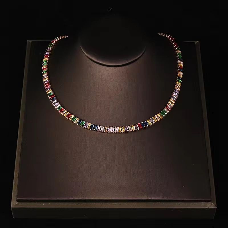 • Necklace and bracelet set • Precision-cut multicolour baguette stones • High-polish gold-tone finish • Structured, symmetrical stone setting for a refined silhouette • Secure clasp for comfortable wear • Statement design with a luxe, contemporary appeal