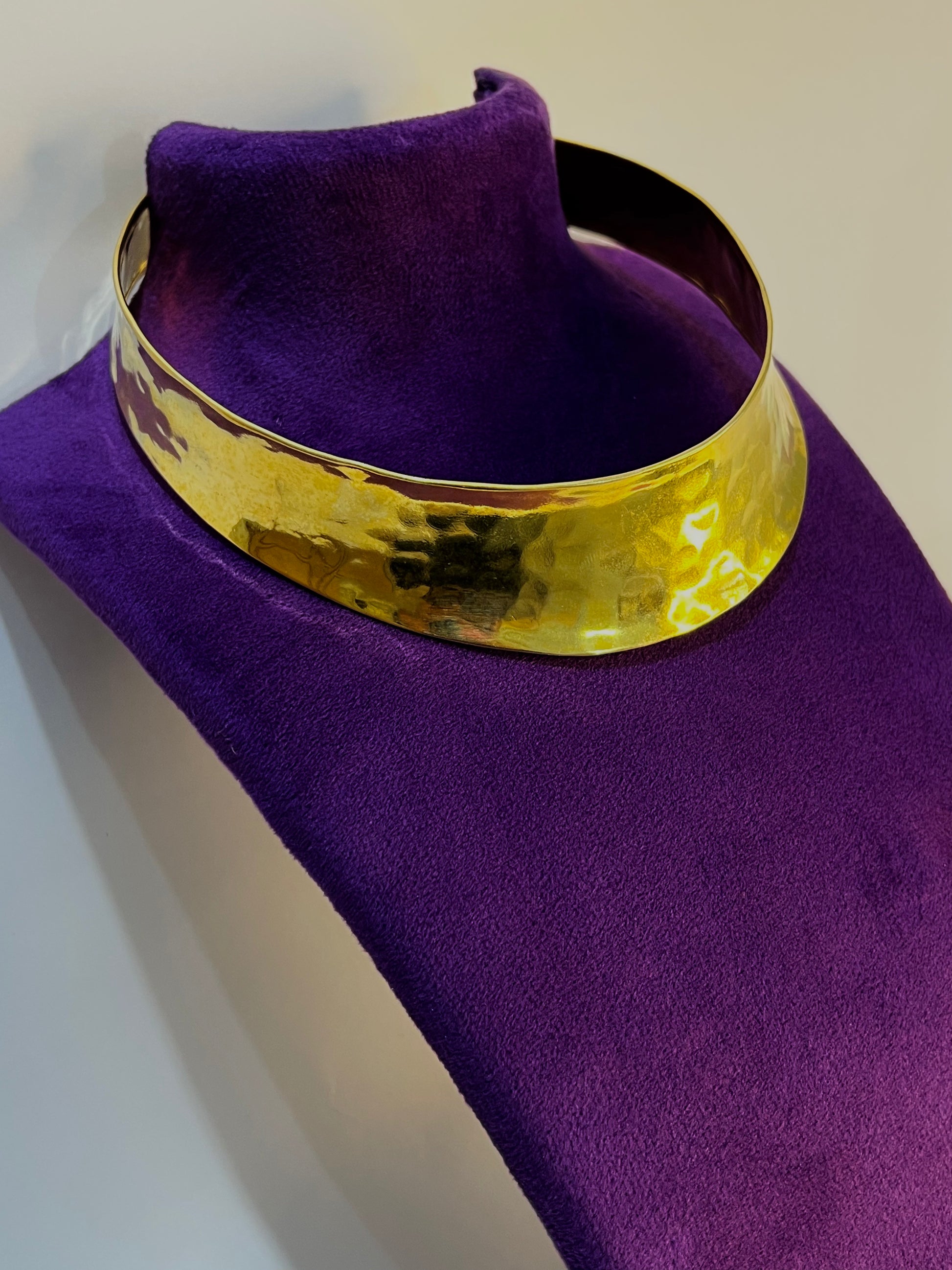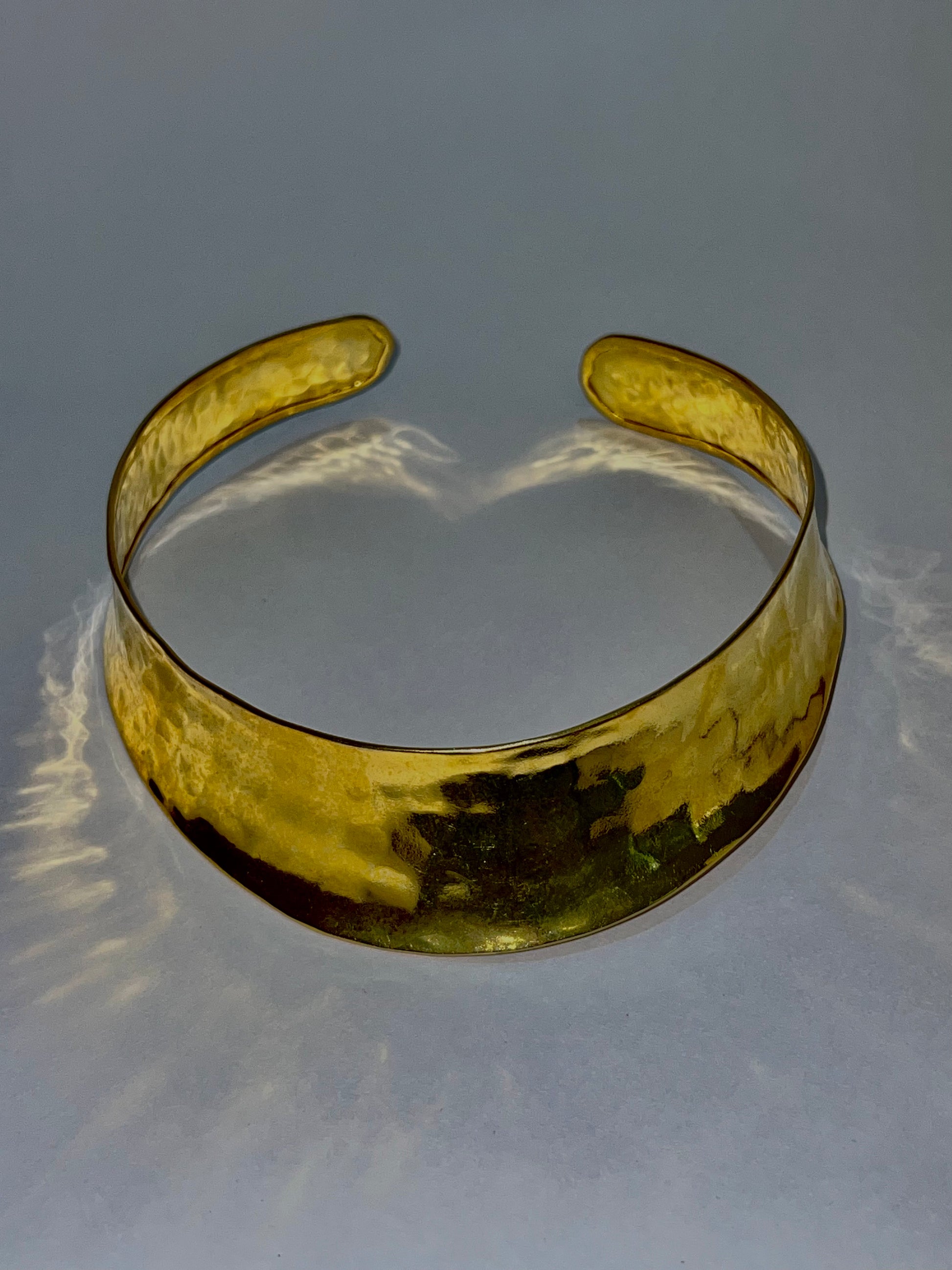 Handcrafted in brass and plated with 18K gold, the Mini Brass Torque is a sleek choker designed to rest gracefully on the collarbone. Its hammered texture adds a luminous play of light, giving depth to a minimal silhouette. Lightweight yet sturdy, this torque offers the perfect balance of comfort and statement style.