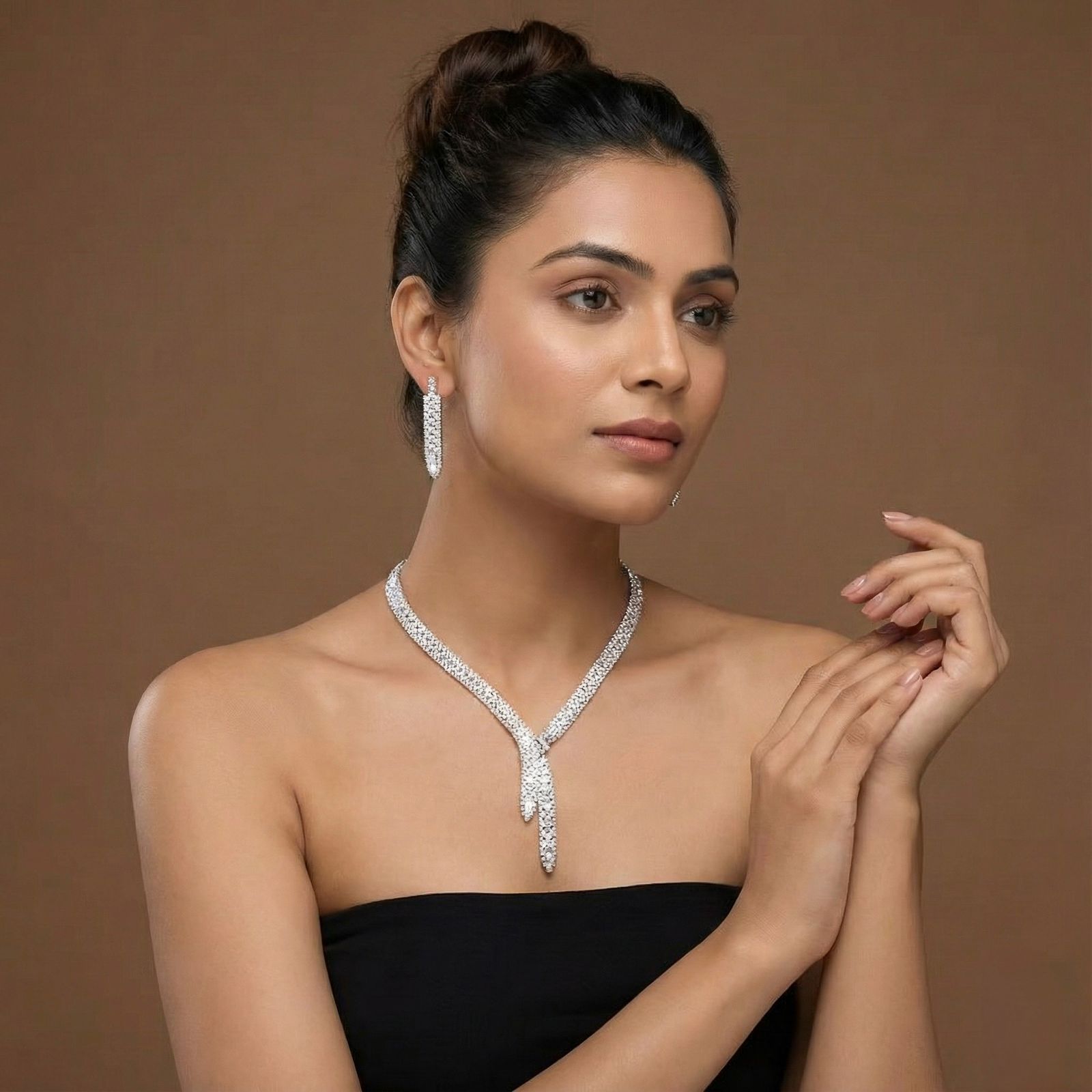 • Style with sleek hair or soft waves to enhance the cascading effect